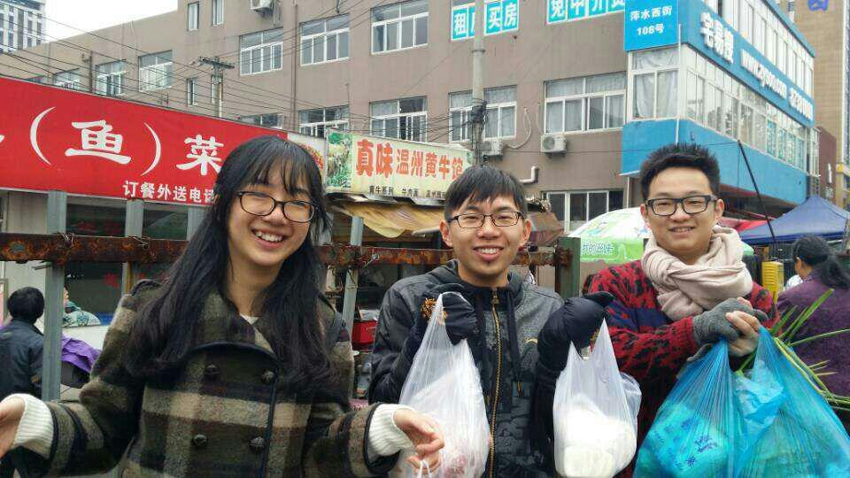 当天上午,有方驰等四名自告奋勇的同学,作为先头部队前往附近菜市场采购做饭所需的食材。整个过程他们精挑细选,和商贩们讨价还价斗智斗勇,通过一上午的活动体验了一把当家买菜的乐趣。图为他们带着米肉蔬菜等各种战利品满载而归。