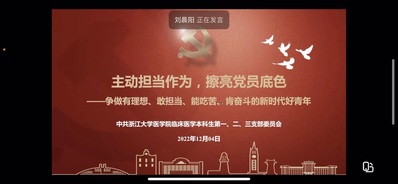 为总结支部党员校园疫情防控期间勇于担当作为工作,回顾初心,凝聚共识,为后续相关工作动员力量。2022124日,临床医学本科生第一、二、三党支部通过钉钉视频会议的形式联合开展“主动担当作为,擦亮党员底色”主题党日活动。本次党日活动共有支部党员36人参加会议,会议由第三党支部书记刘晨阳主持。